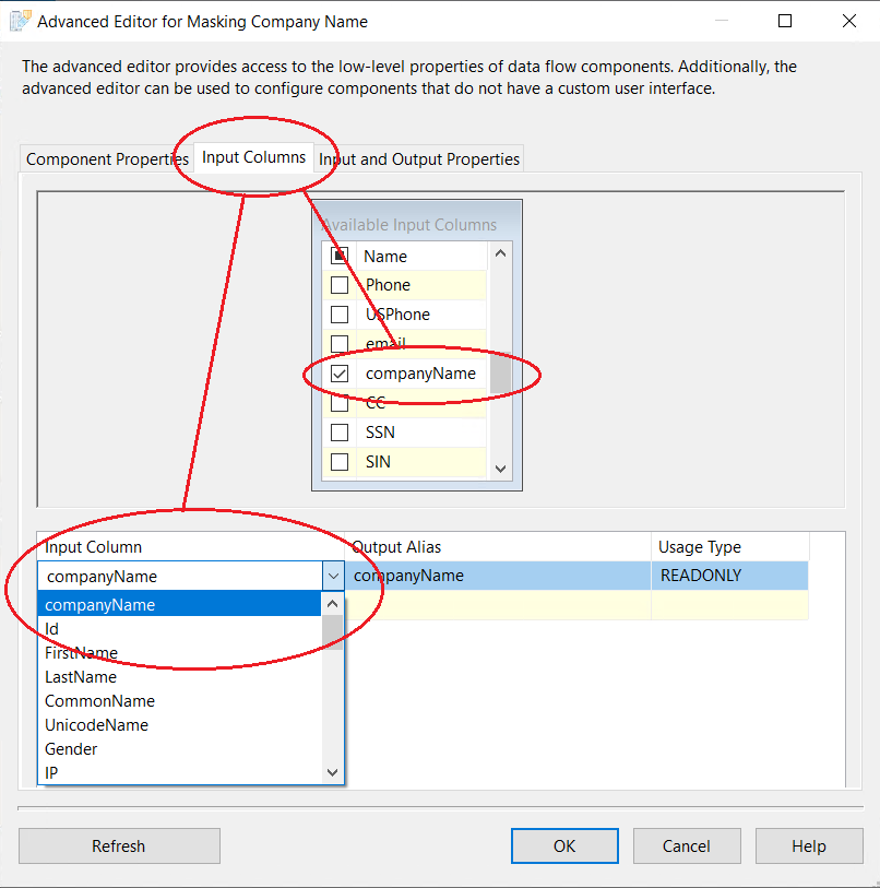 5. In the second tab, there are input columns. Please check-mark only one column, the one that you will be masking with Company Name Dynamic algorithm: