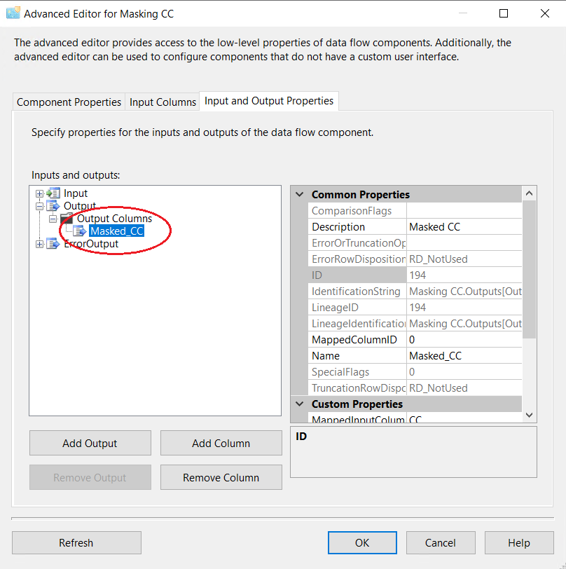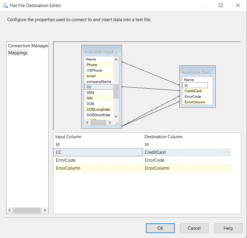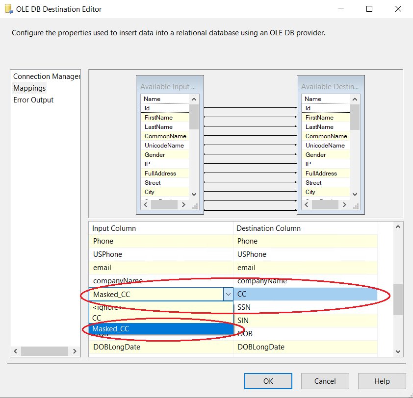 7. Create a connection manager for the destination and configure source component for the destination. In the connection manager, in the tab “Mappings”, specify that you want newly created Field_Masked to be a field replacing the original value. For that, just click on the available input columns, choose the masked value, and map to the “Available Destination Columns”