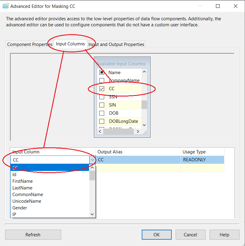 5. In the second tab, there are input columns. Please check-mark only one column, the one that you will be masking with Credit Card algorithm: