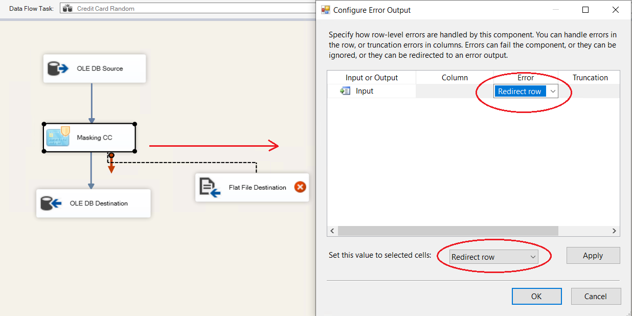 | 9. If, however, there are invalid values in the package's source, one would need to configure error handling. Invalid values are those that are not conforming to the rules of the entity. To handle invalid values, each data masking component has error handling precedence constraint. One needs to create error destination connection and connect red arrow (error handling constraint) with this destination. As the connection is made, one needs to configure the state of failure: “Fail”,”Ignore” or “Redirect”. |