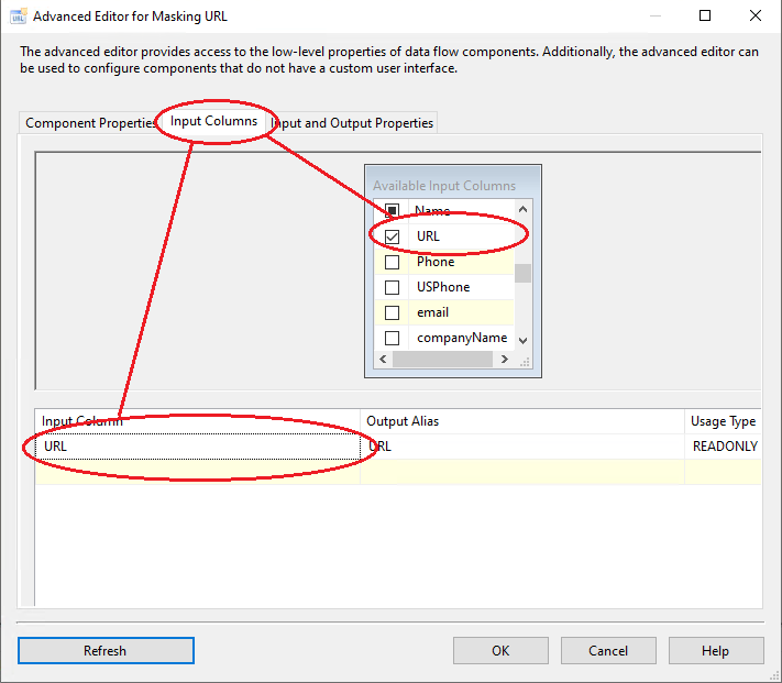 5. In the second tab, there are input columns. Please check-mark only one column, the one that you will be masking with URL algorithm: