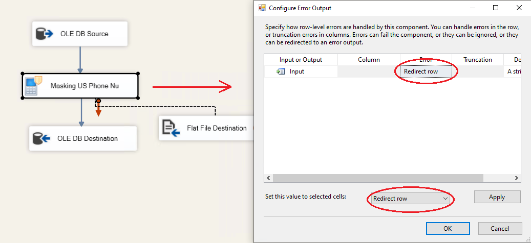 9. If, however, there are invalid values in the package's source, one would need to configure error handling. Invalid values are those that are not conforming to the rules of the entity. To handle invalid values, each data masking component has error handling precedence constraint. One needs to create error destination connection and connect red arrow (error handling constraint) with this destination. As the connection is made, one needs to configure the state of failure: “Fail”,”Ignore” or “Redirect”.