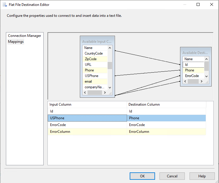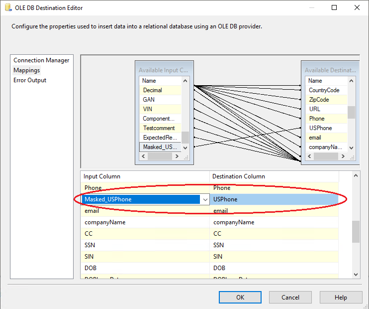 7. Create a connection manager for the destination and configure source component for the destination. In the connection manager, in the tab “Mappings”, specify that you want newly created Field_Masked to be a field replacing the original value. For that, just click on the available input columns, choose the masked value, and map to the “Available Destination Columns”