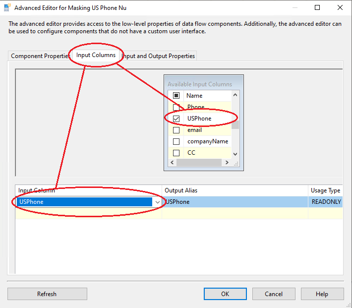 5. In the second tab, there are input columns. Please check-mark only one column, the one that you will be masking with US Phone Nu Dynamic algorithm: